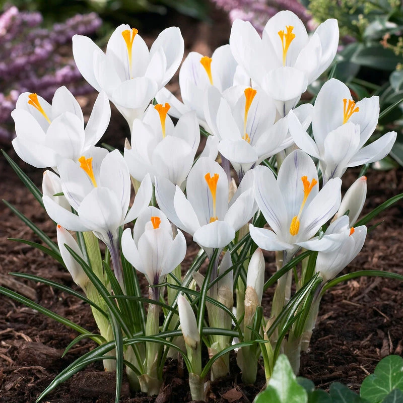 Collection of the following bulbs to create a mass of white blooms: Crocus Jean d’Arc, Allium neapolitanum, Hyacinth Carnegie, Allium Mt Everest
