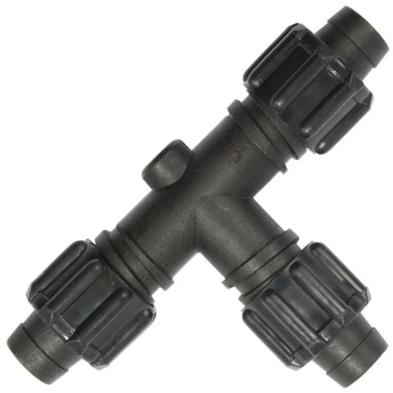 The fitting you need to take Drip Tape runs in three different directions. Ends insert into Drip Tape and secure in place by twisting the lock over the end of the tape.