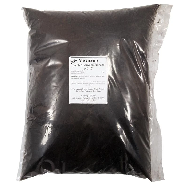 1 lb of Maxicrop is created from over 200 lb of seaweed. Maxicrop is sought after primarily for its trace elements but also has an analysis of 0% N, 0% P, 17% K.