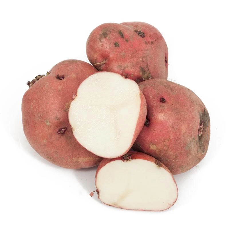 This large round potato has thin, light red skins, deep eyes, and crisp white flesh. Excellent for mashed potatoes and general use. Heat-tolerant, long-storing, and high-yielding. One precaution about this variety: the skin is so thin it should allowed to cure and firm up for a week or two in the ground after the vines die back.